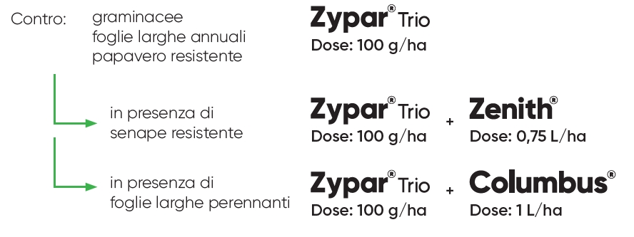Zypar Trio è progettato per chi cerca un erbicida completo per il controllo delle infestanti dei cereali, anche dove le resistenze di senaoe e papavero compromettono l’efficacia dei prodotti convenzionali.